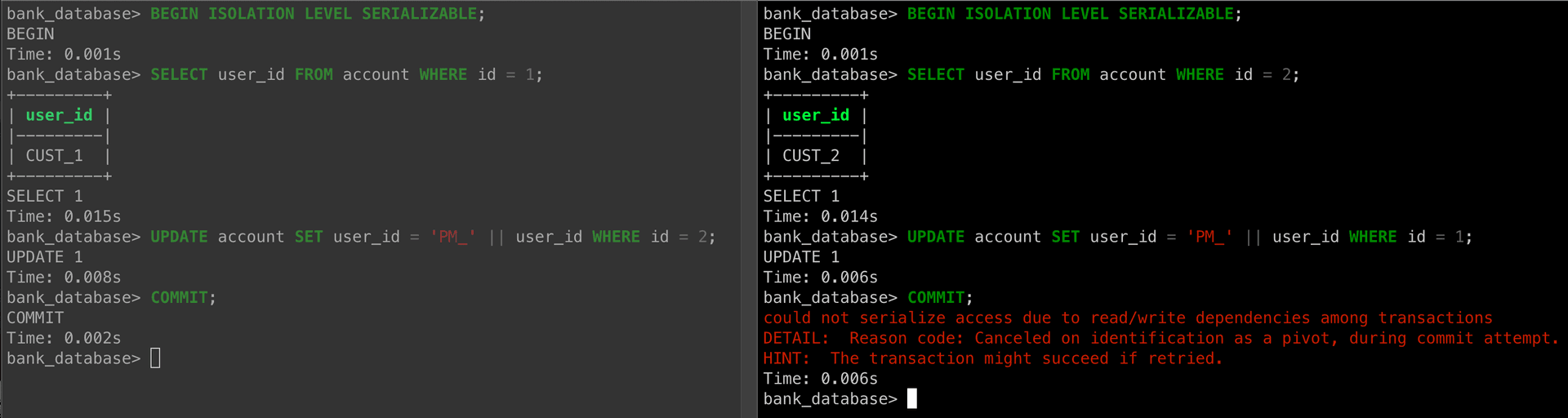 - PostgreSQL detects the conflicting dependency between the two transactions when they attempt to commit.